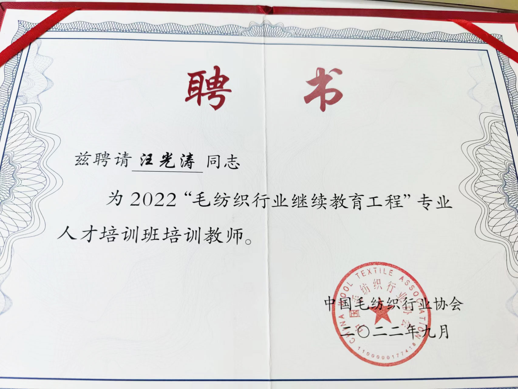 六天,十二位專家、學(xué)者,十三項(xiàng)課程,六十二個(gè)課時(shí)。通過(guò)結(jié)合行業(yè)高質(zhì)量發(fā)展需求,針對(duì)性的開(kāi)發(fā)培訓(xùn)內(nèi)容,巧妙融合生產(chǎn)實(shí)戰(zhàn)經(jīng)驗(yàn)與案例分析,讓課程系統(tǒng)全面并貼近實(shí)際,內(nèi)容豐富。友聯(lián)裝備毛紡應(yīng)用部經(jīng)理汪光濤受邀擔(dān)任培訓(xùn)講師,現(xiàn)場(chǎng)發(fā)放了培訓(xùn)教師聘書(shū)。