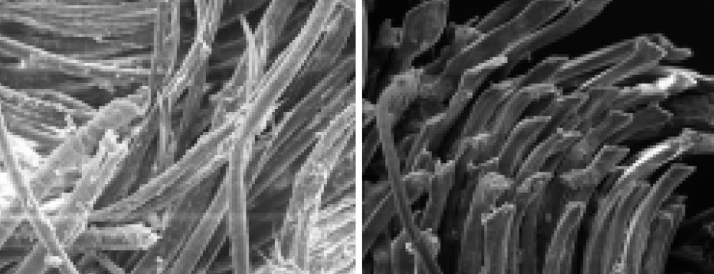 可機洗羊毛纖維(左圖)和聚酯(右圖)在90天實驗中分解狀態