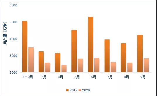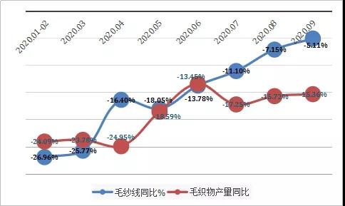一至三季度,毛紡主要產品的產量跌幅處于穩定收窄的區間,前9個月毛紗線累計產量13萬噸,同比跌幅5.1%,累計產量跌幅從5月以來持續收窄(見圖2)。同期毛織物累計產量2.2億米,同比跌幅15.36%,也處于跌幅收窄的區間(見圖2)。但是從月產量來看,毛紗線與毛織物產量情況不盡相同,毛紗線月產量已經達到并超過上年同期水平,而毛織物月產量仍明顯低于上年同期水平(見圖3、圖4),說明毛紗線所代表的毛針織產品和毛織物所代表的毛梭織產品的生產形勢有所差異。