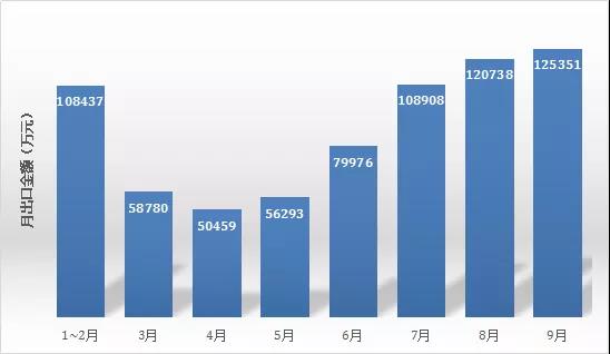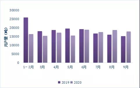 根據中國海關數據,1~9月,毛紡原料及制品出口總額為95.8億,跌幅為25.2%, 7月以來月出口額呈逐月上升(見圖6)。從出口產品看,毛針織服裝出口情況呈現了較快恢復,出口量跌幅25%,較上半年回調22個百分點。