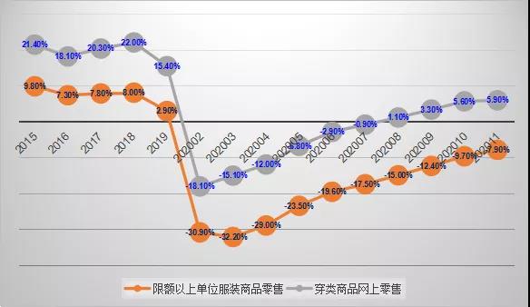 從網(wǎng)上銷售數(shù)據(jù)看,在“雙十一”促進消費的11月份,網(wǎng)上商品整體銷售規(guī)模雖然不及2019年,但是穿類商品的銷售規(guī)模同比則有所擴張。2020年全年服裝類產(chǎn)品增速一直落后,因此,在年底購物節(jié)等銷售促進活動中的較好表現(xiàn),也證明了未來的復(fù)蘇潛力。