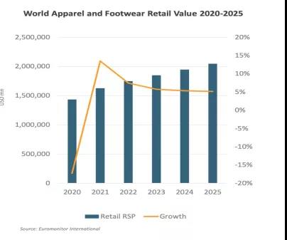 全球紡織服裝的消費市場預(yù)計將在2021年迎來反彈。但是,市場信心和消費的重塑不是一蹴而就的,消費水平和規(guī)模恢復(fù)到疫情前的水平,可能需要數(shù)年的時間。根據(jù)Euromonitor的預(yù)測,2021年,全球紡織服裝的零售額將達到10%以上的增速,預(yù)計到2023年恢復(fù)到2019年水平。