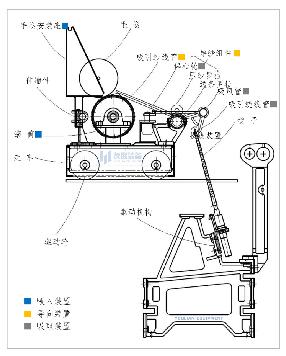 紗線喂入裝置:毛卷安裝座以及設(shè)置在安裝座上的若干毛卷,毛卷安裝座可拆卸安裝在走車上方,毛卷安裝座一側(cè)設(shè)置有滾筒安裝座,滾筒安裝座上設(shè)置有滾筒。